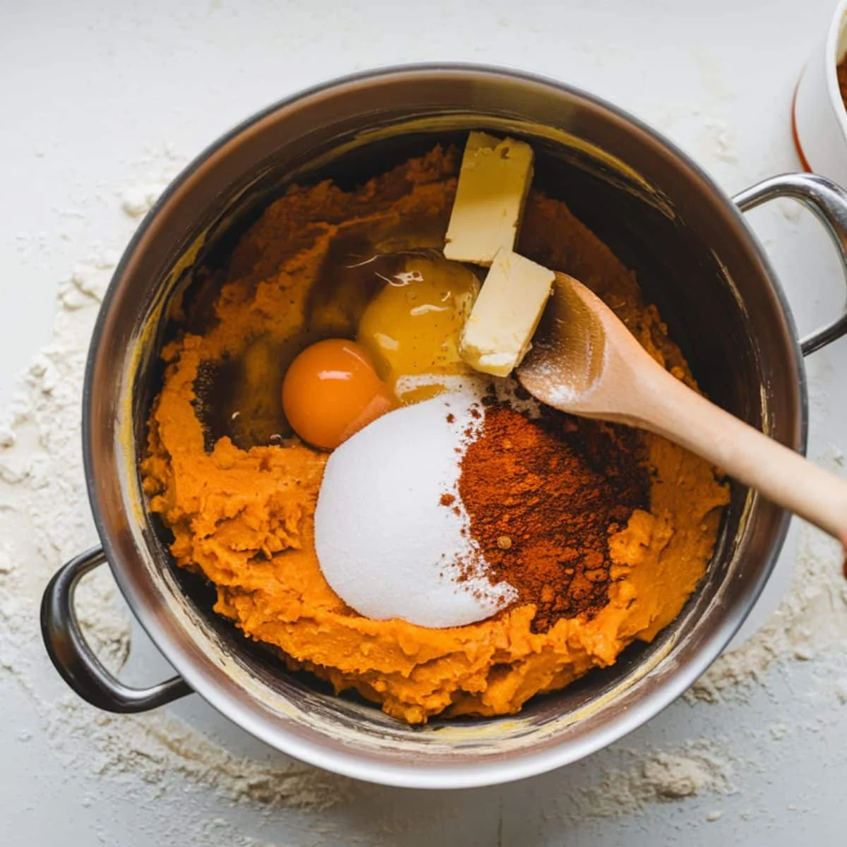 - Prepare and Mix : Mixing the sweet potato filling until smooth and well-combined.